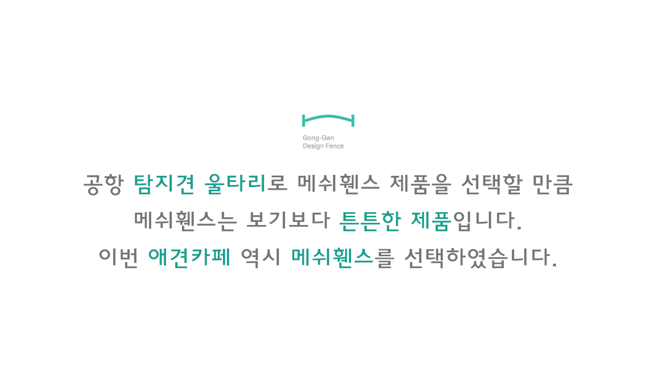 이번 현장은 애견카페 전체를 메쉬 휀스를 이용하여 울타리를 설치했으며, 사무실 진입로 앞 양문(양개도어), 카페 내 외문 모두 메쉬 휀스 제품들을 사용하였습니다.