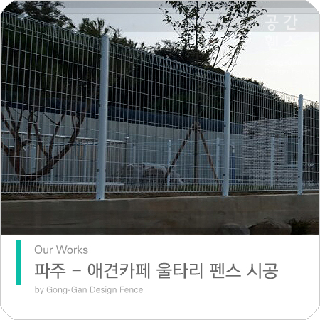 흔히들 녹색 철망 휀스라고 알고 계시는 메쉬 휀스는 가장 다양한 현장에 활용되는 휀스 제품입니다. 이번에 보여드릴 현장은 경기도 파주에 위치한 한 애견카페에 울타리로 메쉬 휀스를 이용하여 공사를 한 현장입니다. 메쉬 휀스는 아연도금된 철선에 분체도장을 한 제품으로 많이들 약하실 거라고 생각하시는데, 실제로는 매우 튼튼한 휀스 입니다. 대형견이 물어 뜯는다고 해서 뜯기는 그런 제품은 아닙니다.