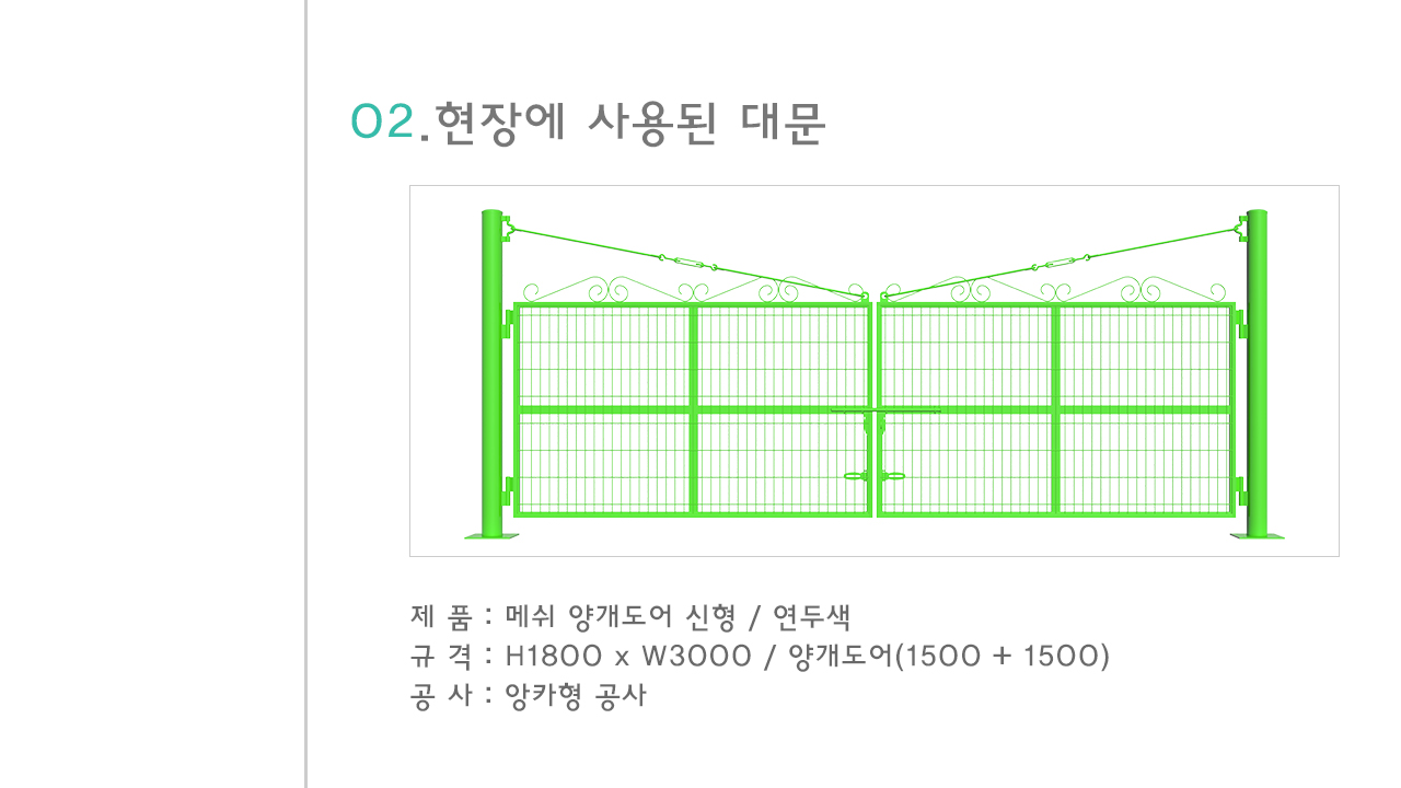 이 현장은 추후 건축 계획도 있으셨기 때문에 차량이 드나들 수 있도록 펜스문도 구역에 맞게 제작하여 설치하였습니다. 보통 빈 토지 같은 경우도 추후에 건축 계획이 생길 수 있기 때문에 차량 통행용 펜스문을 미리 설치하시는 경우가 많습니다.