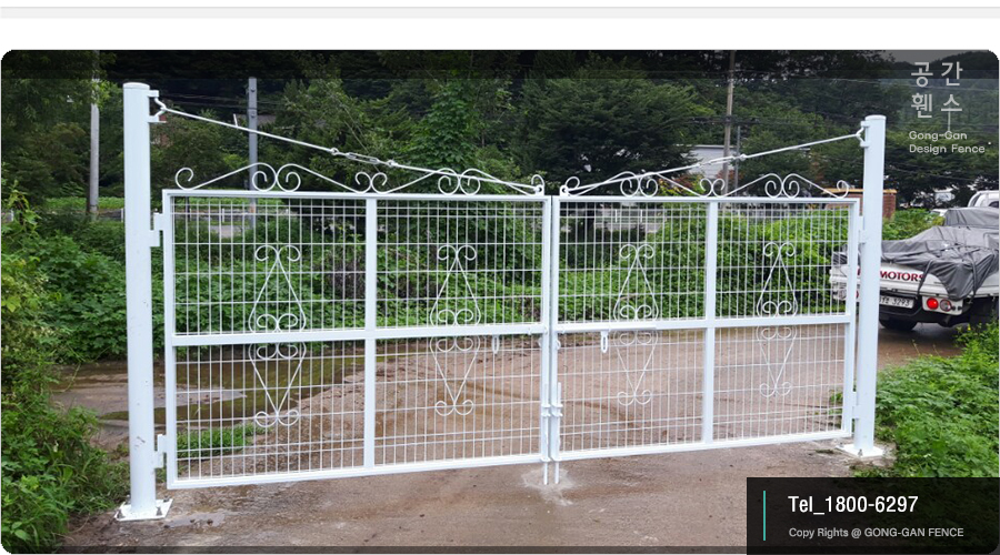 메쉬휀스 대문의 구조상 위 사진처럼 열리는 것이 일반적 이지만 시공법을 달리하여 문을 한쪽으로만 180도 가 열리게 할 수도 있습니다. 즉 대문이 완전히 열려 양쪽 벽에 붙게 시공을 할 수도 있습니다. 다만 이렇게 시공을 하게되면 문이 반드시 한쪽 방향으로만 열리게 됩니다. 이렇게 시공을 하는 현장은 주택 진입로 입구와 도로가 가까운데 그 도로의 폭이 좁을 경우 이런 시공법을 고려하기도 합니다.(접이식 대문도 한가지 방법입니다)