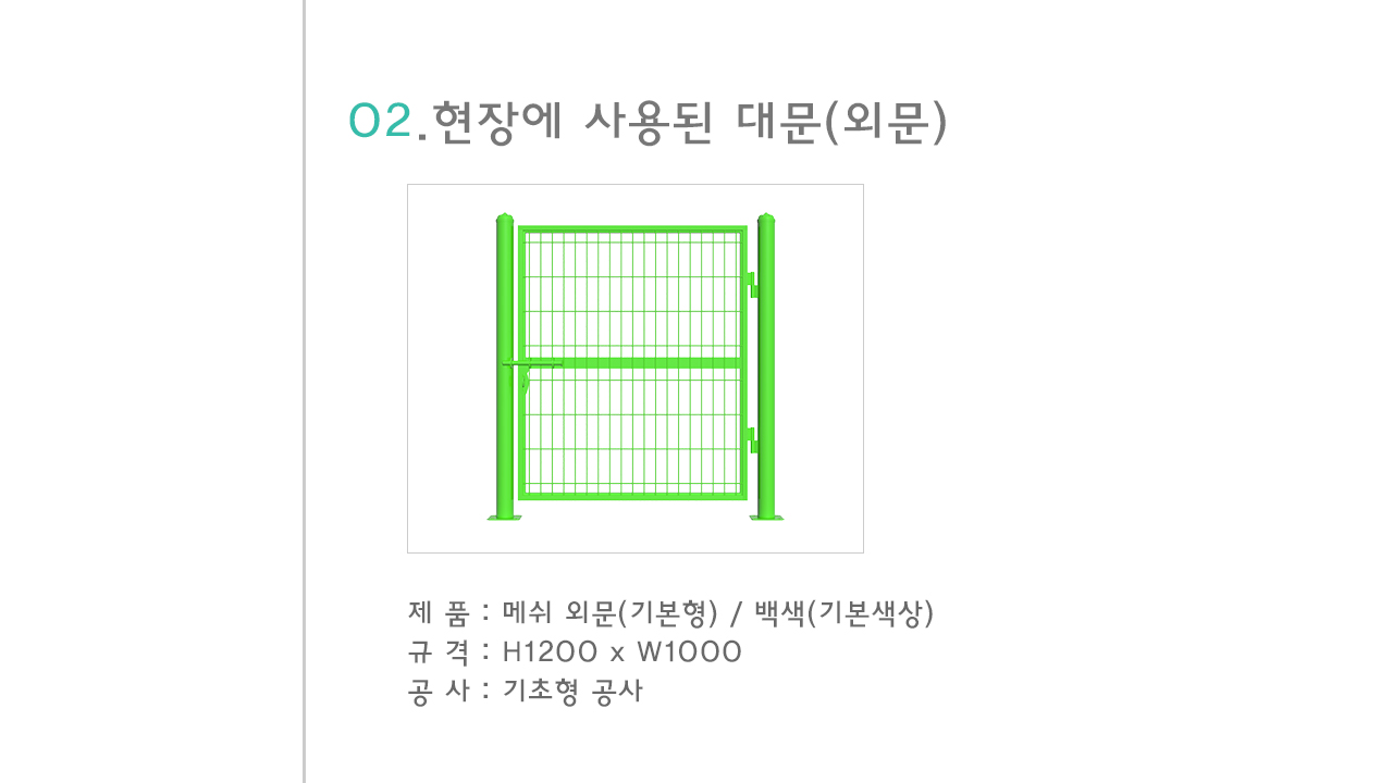 이번 현장의 경우 외문 1조를 제외하면 전부 기초형으로 시공을 하였습니다. 펜스 대문과 마찬가지로 펜스 외문도 원하시는 규격으로 제작이 가능하지만 일반적으로 펜스 외문은 길이 1000(1m) 제품이 가장 많이 이용됩니다. 그래서 보통 메시펜스 외문 하면 길이 1000 제품을 말합니다. 메시 외문의 경우 빗장이라고 하는 문을 잠글 수 있는 고리가 있습니다. 현장에 따라서 이 빗장을 양쪽 모두에 설치하기도 하고 한쪽에만 설치하기도 합니다.