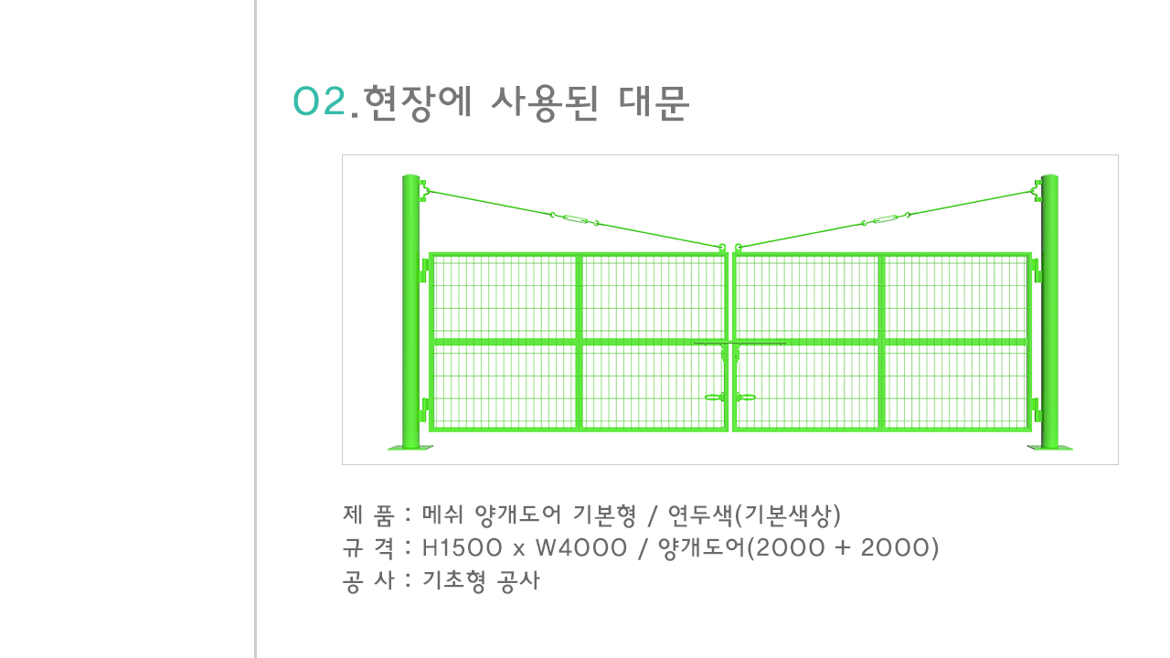 많은 분들이 녹색 철망 울타리 라고 알고계신 제품의 정확한 명칭은 메쉬휀스 혹은 메쉬펜스 라고 합니다. 한국어로 하면 철망울타리 라고 할 수 있습니다. 메쉬휀스는 아연도금된 철선에 분체도장을 한 제품으로 가격이 저렴하고 시공이 간편하다는 장점이 있어 가장 많은 현장에서 사용되는 휀스 제품입니다.