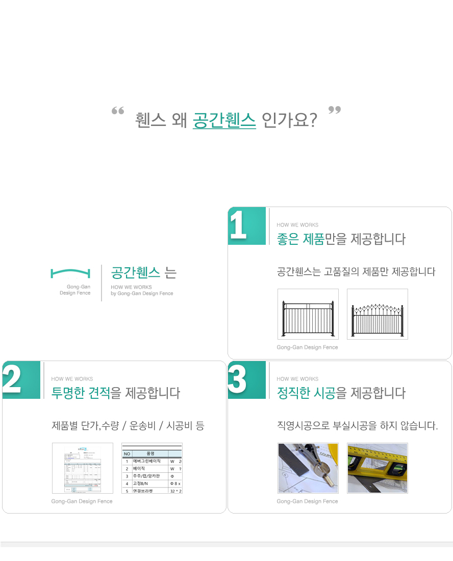 공간휀스는 하청시공이나 용역시공을 대신 직영시공제로 운영되고 있습니다. 그렇기에 모든 현장을 최선을 다해 시공해 드리고 있습니다. 더 다양한 제품, 더 다양한 시공현장을 보여드리기 위해 노력하는 공간휀스가 되겠습니다. 감사합니다.